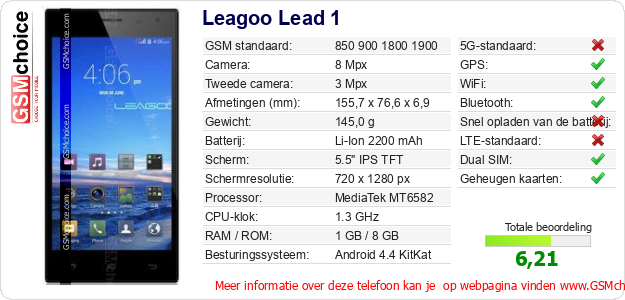 Gegevens van de telefoon Leagoo Lead 1 op jouw webpagina