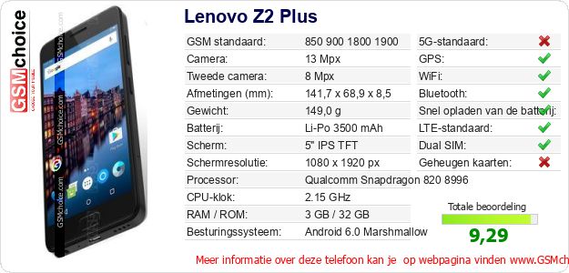 Gegevens van de telefoon Lenovo Z2 Plus op jouw webpagina