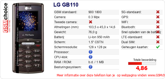Gegevens van de telefoon LG GB110 op jouw webpagina