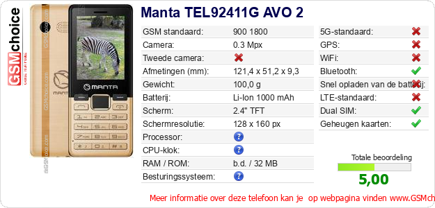 Gegevens van de telefoon Manta TEL92411G AVO 2 op jouw webpagina