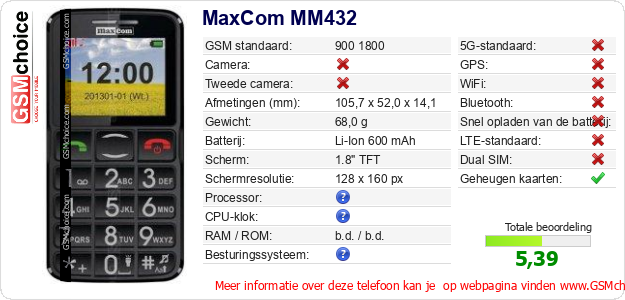 Gegevens van de telefoon MaxCom MM432 op jouw webpagina