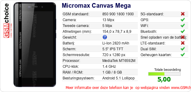 Gegevens van de telefoon Micromax Canvas Mega op jouw webpagina