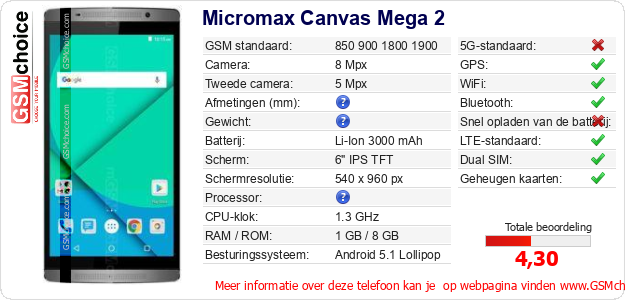 Gegevens van de telefoon Micromax Canvas Mega 2 op jouw webpagina