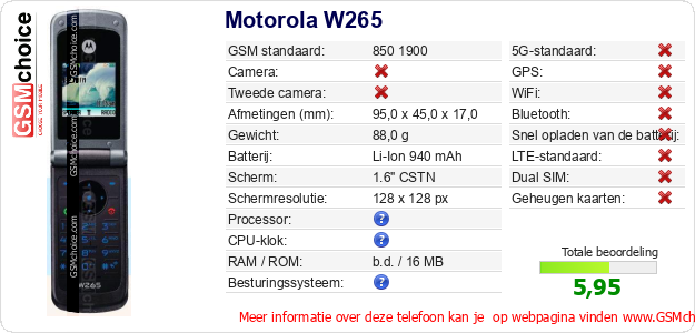 Verkoop je op ebay.com? Heb je jouw eigen webpagina? Als je de basisgegevens over Motorola W265 ergens wilt publiceren, dan is het heel simpel. Het is voldoende om deze code te kopiëren en op jouw webpagina te plakken:Als je deze code plakt, dan wordt de onderstaande afbeelding getoond: