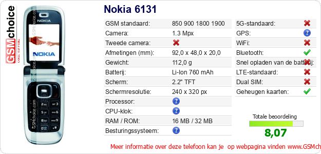 Verkoop je op ebay.com? Heb je jouw eigen webpagina? Als je de basisgegevens over Nokia 6131 ergens wilt publiceren, dan is het heel simpel. Het is voldoende om deze code te kopiëren en op jouw webpagina te plakken:Als je deze code plakt, dan wordt de onderstaande afbeelding getoond:
