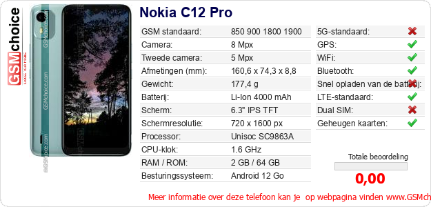 Gegevens van de telefoon Nokia C12 Pro op jouw webpagina