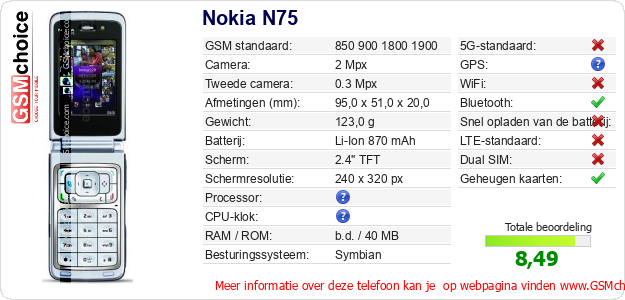 Gegevens van de telefoon Nokia N75 op jouw webpagina