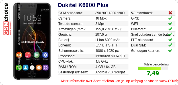 Gegevens van de telefoon Oukitel K6000 Plus op jouw webpagina