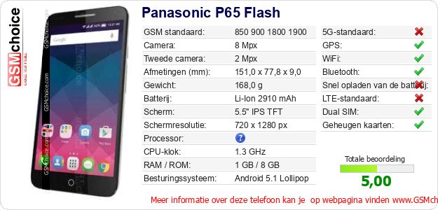 Gegevens van de telefoon Panasonic P65 Flash op jouw webpagina