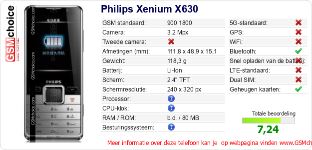 Verkoop je op ebay.com? Heb je jouw eigen webpagina? Als je de basisgegevens over Philips Xenium X630 ergens wilt publiceren, dan is het heel simpel. Het is voldoende om deze code te kopiëren en op jouw webpagina te plakken:Als je deze code plakt, dan wordt de onderstaande afbeelding getoond: