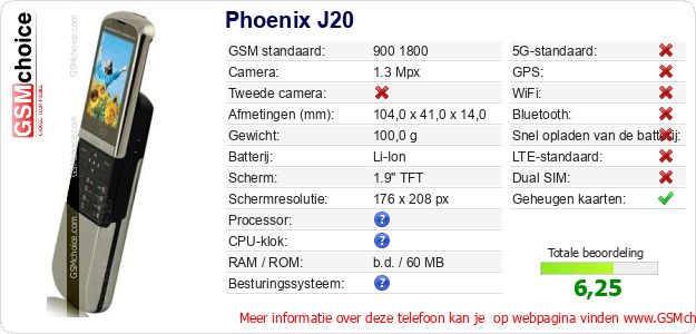 Gegevens van de telefoon Phoenix J20 op jouw webpagina