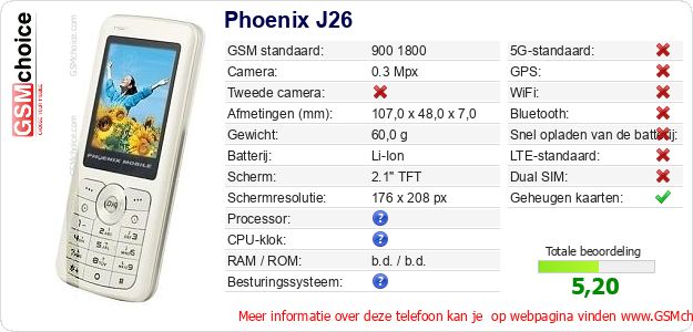 Gegevens van de telefoon Phoenix J26 op jouw webpagina
