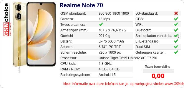 Gegevens van de telefoon Realme Note 70 op jouw webpagina