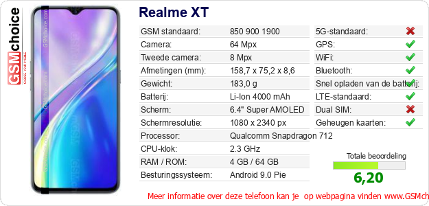 Verkoop je op ebay.com? Heb je jouw eigen webpagina? Als je de basisgegevens over Realme XT ergens wilt publiceren, dan is het heel simpel. Het is voldoende om deze code te kopiëren en op jouw webpagina te plakken:Als je deze code plakt, dan wordt de onderstaande afbeelding getoond: