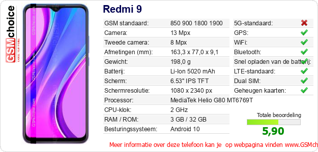 Verkoop je op ebay.com? Heb je jouw eigen webpagina? Als je de basisgegevens over Redmi 9 ergens wilt publiceren, dan is het heel simpel. Het is voldoende om deze code te kopiëren en op jouw webpagina te plakken:Als je deze code plakt, dan wordt de onderstaande afbeelding getoond: