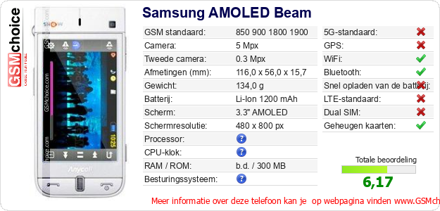 Gegevens van de telefoon Samsung AMOLED Beam op jouw webpagina