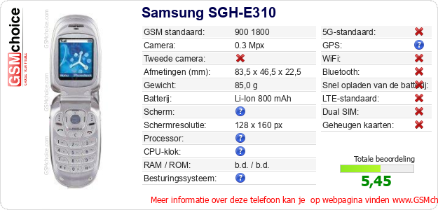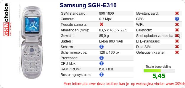Verkoop je op ebay.com? Heb je jouw eigen webpagina? Als je de basisgegevens over Samsung SGH-E310 ergens wilt publiceren, dan is het heel simpel. Het is voldoende om deze code te kopiëren en op jouw webpagina te plakken:Als je deze code plakt, dan wordt de onderstaande afbeelding getoond: