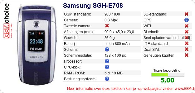 Verkoop je op ebay.com? Heb je jouw eigen webpagina? Als je de basisgegevens over Samsung SGH-E708 ergens wilt publiceren, dan is het heel simpel. Het is voldoende om deze code te kopiëren en op jouw webpagina te plakken:Als je deze code plakt, dan wordt de onderstaande afbeelding getoond:
