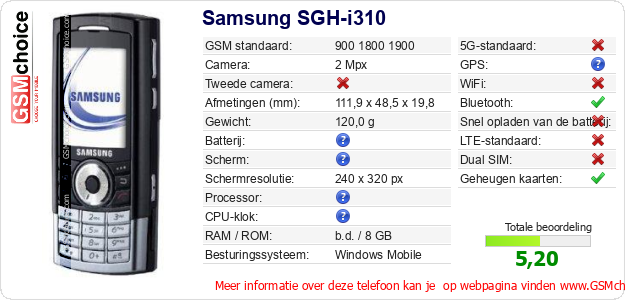 Verkoop je op ebay.com? Heb je jouw eigen webpagina? Als je de basisgegevens over Samsung SGH-i310 ergens wilt publiceren, dan is het heel simpel. Het is voldoende om deze code te kopiëren en op jouw webpagina te plakken:Als je deze code plakt, dan wordt de onderstaande afbeelding getoond:
