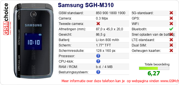 Verkoop je op ebay.com? Heb je jouw eigen webpagina? Als je de basisgegevens over Samsung SGH-M310 ergens wilt publiceren, dan is het heel simpel. Het is voldoende om deze code te kopiëren en op jouw webpagina te plakken:Als je deze code plakt, dan wordt de onderstaande afbeelding getoond: