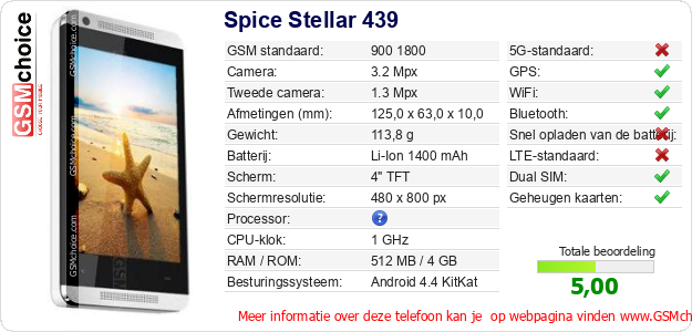 Verkoop je op ebay.com? Heb je jouw eigen webpagina? Als je de basisgegevens over Spice Stellar 439 ergens wilt publiceren, dan is het heel simpel. Het is voldoende om deze code te kopiëren en op jouw webpagina te plakken:Als je deze code plakt, dan wordt de onderstaande afbeelding getoond: