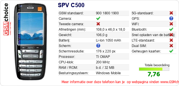 Gegevens van de telefoon SPV C500 op jouw webpagina