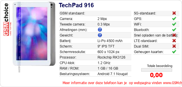 Gegevens van de telefoon TechPad 916 op jouw webpagina