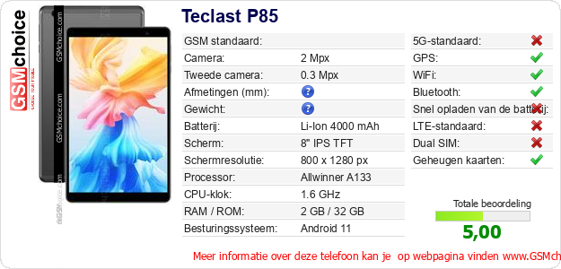 Gegevens van de telefoon Teclast P85 op jouw webpagina