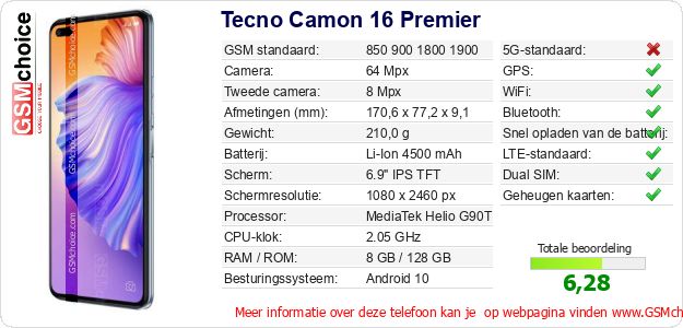 Verkoop je op ebay.com? Heb je jouw eigen webpagina? Als je de basisgegevens over Tecno Camon 16 Premier ergens wilt publiceren, dan is het heel simpel. Het is voldoende om deze code te kopiëren en op jouw webpagina te plakken:Als je deze code plakt, dan wordt de onderstaande afbeelding getoond: