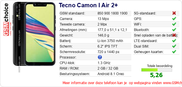 Verkoop je op ebay.com? Heb je jouw eigen webpagina? Als je de basisgegevens over Tecno Camon I Air 2+ ergens wilt publiceren, dan is het heel simpel. Het is voldoende om deze code te kopiëren en op jouw webpagina te plakken:Als je deze code plakt, dan wordt de onderstaande afbeelding getoond: