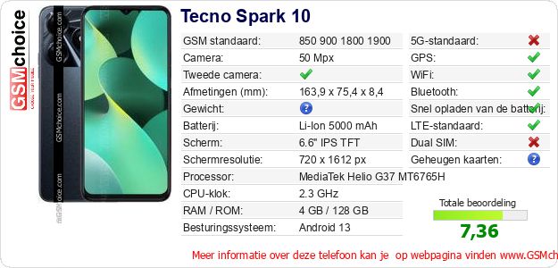 Verkoop je op ebay.com? Heb je jouw eigen webpagina? Als je de basisgegevens over Tecno Spark 10 ergens wilt publiceren, dan is het heel simpel. Het is voldoende om deze code te kopiëren en op jouw webpagina te plakken:Als je deze code plakt, dan wordt de onderstaande afbeelding getoond: