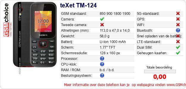 Gegevens van de telefoon teXet TM-124 op jouw webpagina