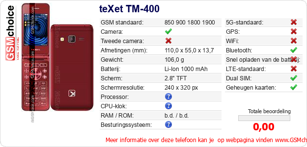 Gegevens van de telefoon teXet TM-400 op jouw webpagina