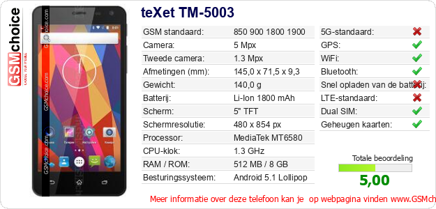 Gegevens van de telefoon teXet TM-5003 op jouw webpagina