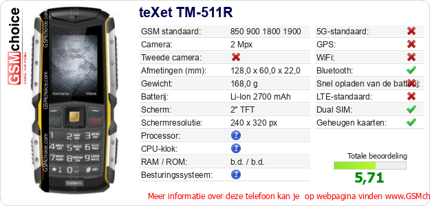 Gegevens van de telefoon teXet TM-511R op jouw webpagina