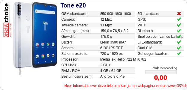 Gegevens van de telefoon Tone e20 op jouw webpagina