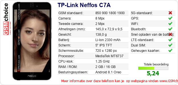 Verkoop je op ebay.com? Heb je jouw eigen webpagina? Als je de basisgegevens over TP-Link Neffos C7A ergens wilt publiceren, dan is het heel simpel. Het is voldoende om deze code te kopiëren en op jouw webpagina te plakken:Als je deze code plakt, dan wordt de onderstaande afbeelding getoond:
