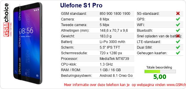 Gegevens van de telefoon Ulefone S1 Pro op jouw webpagina