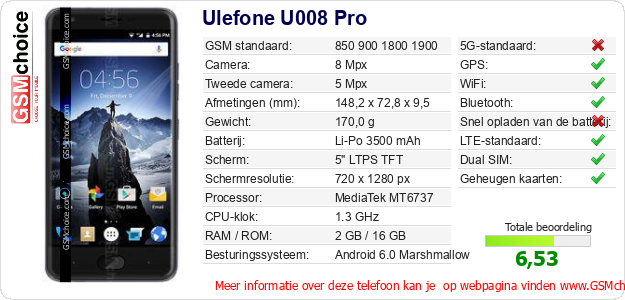 Gegevens van de telefoon Ulefone U008 Pro op jouw webpagina