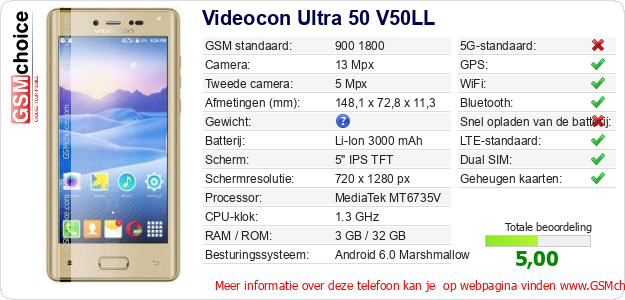 Gegevens van de telefoon Videocon Ultra 50 V50LL op jouw webpagina