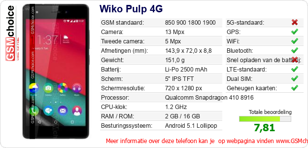 Verkoop je op ebay.com? Heb je jouw eigen webpagina? Als je de basisgegevens over Wiko Pulp 4G ergens wilt publiceren, dan is het heel simpel. Het is voldoende om deze code te kopiëren en op jouw webpagina te plakken:Als je deze code plakt, dan wordt de onderstaande afbeelding getoond: