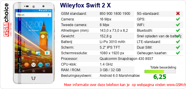 Gegevens van de telefoon Wileyfox Swift 2 X op jouw webpagina