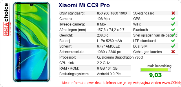 Gegevens van de telefoon Xiaomi Mi CC9 Pro op jouw webpagina
