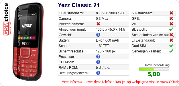 Gegevens van de telefoon Yezz Classic 21 op jouw webpagina