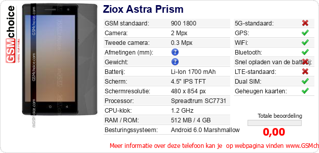 Gegevens van de telefoon Ziox Astra Prism op jouw webpagina