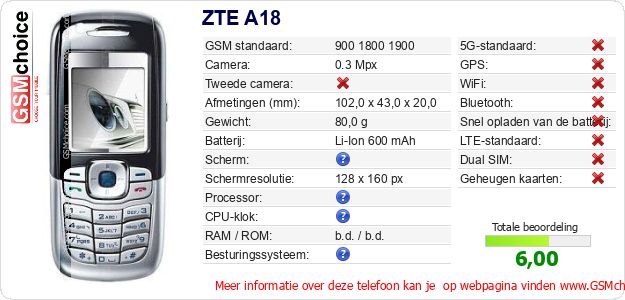 Verkoop je op ebay.com? Heb je jouw eigen webpagina? Als je de basisgegevens over ZTE A18 ergens wilt publiceren, dan is het heel simpel. Het is voldoende om deze code te kopiëren en op jouw webpagina te plakken:Als je deze code plakt, dan wordt de onderstaande afbeelding getoond: