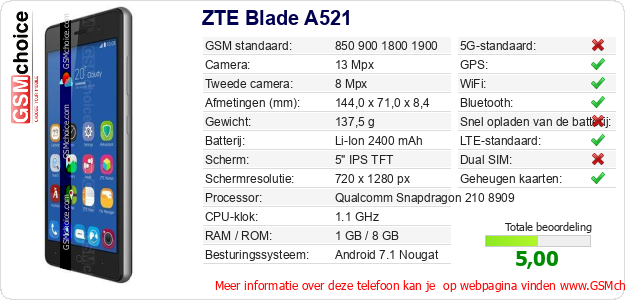 Gegevens van de telefoon ZTE Blade A521 op jouw webpagina