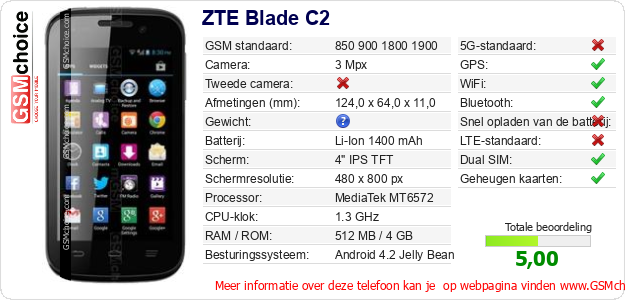 Gegevens van de telefoon ZTE Blade C2 op jouw webpagina