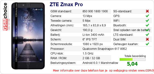 Verkoop je op ebay.com? Heb je jouw eigen webpagina? Als je de basisgegevens over ZTE Zmax Pro ergens wilt publiceren, dan is het heel simpel. Het is voldoende om deze code te kopiëren en op jouw webpagina te plakken:Als je deze code plakt, dan wordt de onderstaande afbeelding getoond:
