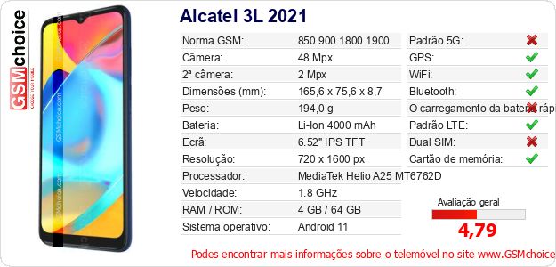 Dados sobre o telemóvel Alcatel 3L 2021 na sua página